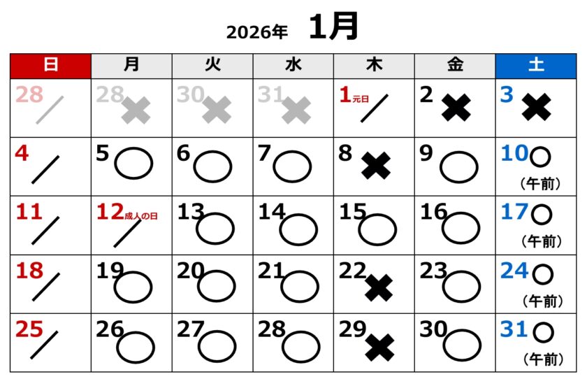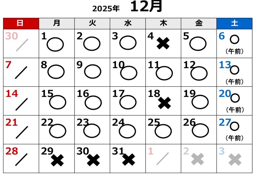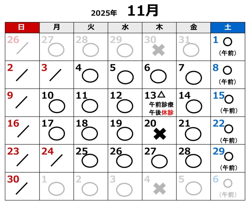 【休診】日曜・祝日・1ヶ月に2~3日の不定の木曜日(下記診療日表参照してください)