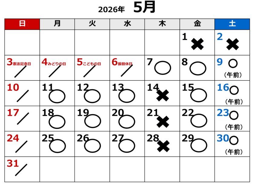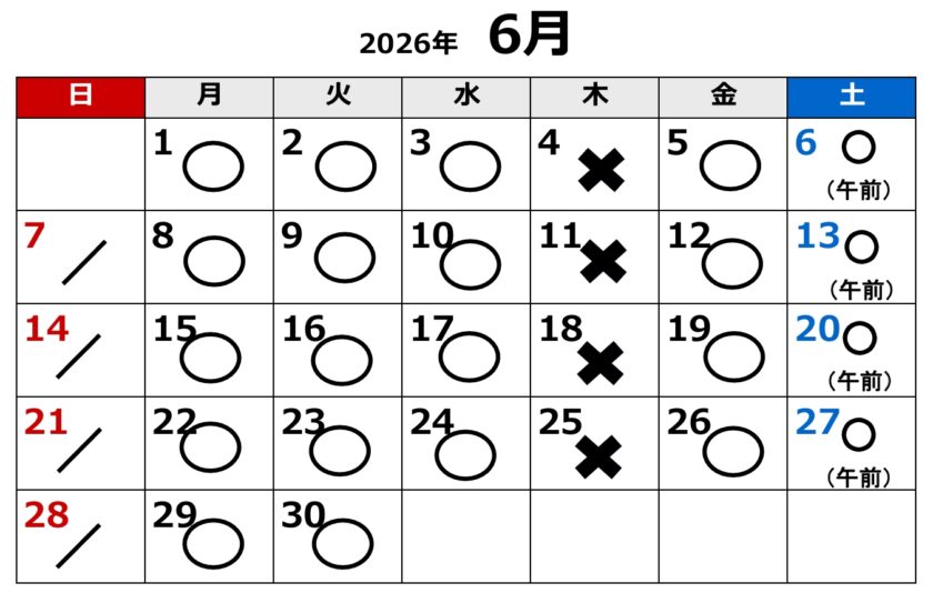 【休診】日曜・祝日・1ヶ月に2~3日の不定の木曜日(下記診療日表参照してください)