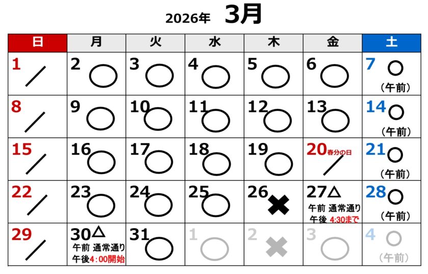 都合により3月30日(月)の午後の診療開始時間が午後4:00頃になる予定です。受付は通常通り可能です。